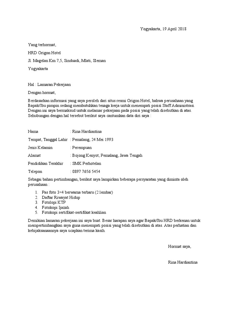 Contoh Surat Lamaran Kerja Di Hotel Pdf